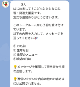 「発達カウンセリング」「心理・発達検査」は初回面談(無料/電話/20分)が必要になります。まずは、公式LINEからご予約ください。その後の流れにつきましては、初回面談の際にお伝えさせていただきます。